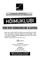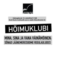 Kolmapäeval, 13. märtsil kell 17.00 koguneb taas Hõimuklubi. Sel korral on õhtu teemaks “Mina, sina ja vana Väinämöinen: sõnad läänemeresoome regilauludes”. Õhtut veab folklorist Mari … Sündmuse korraldajad: MTÜ Fenno-Ugria Asutus, Eesti Keele Instituut. Toetajad: Eesti Kultuurkapital, Tallinna Kultuuriväärtuste Amet jaHTM hõimurahvaste programm. Ajaloolane Aivar Põldvee räägib oma ettekandes ajalooallikatest ja uurimis-meetoditest, mis võimaldavad … Korraldajad: MTÜ Fenno-Ugria Asutus, Eesti Keele Instituut Toetajad: Tallinna Kultuuriamet, Eesti Kultuurkapital, HTM hõimurahvaste programm. Soome-ugri keeleteadlane Jack Rueter Helsingi Ülikoolist räägib Mordvamaal elavate ersade ja mokšade … Korraldajad: MTÜ Fenno-Ugria Asutus, Eesti Keele Instituut Toetajad: Tallinna Kultuuriamet, Eesti Kultuurkapital, HTM hõimurahvaste programm Kevade viimaseses hõimuklubis on loengu teema saanud tõuke Enn Haabsaare … Väljakutsed, võimalused ja ohud Klubiõhtud toimuvad aastast 2001. Korraldajad: MTÜ Fenno-Ugria Asutus, Eesti Keele Instituut, Eesti Ungari Selts, Ungari Instituut Toetavad: Tallinna Kultuuriväärtuste Amet, Eesti Kultuurkapital, HTM hõimurahvaste programm Keeleteadlane Szilárd Tibor Tóth … XII soome-ugri seminar Korraldajad: MTÜ Fenno-Ugria Asutus, Eesti Keele Instituut Toetajad: Tallinna Kultuuriamet, Eesti Kultuurkapital, HTM hõimurahvaste programm 2020. aasta esimeses hõimuklubis räägib ajaloolane Linda Kaljundi (Tallinna Ülikool) … Hõimuklubis räägib folklorist Ergo-Hart Västrik sellest, mis teda Paul Ariste vadja päevikute väljaannet koostades kõige enam üllatas ja kuidas aitavad need päevikud lahti mõtestada Ariste vadja keele ja rahvaluule alaseid kirjapanekuid. Korraldajad: MTÜ Fenno-Ugria Asutus, Eesti Keele Instituut Toetajad:Tallinna Kultuuriamet, Eesti Kultuurkapitale Mis on soomeugrilus ning milline on selle koht Eesti kultuuriloos ja rahvateaduses? Milline on keelesuguluse kaal … ERMi teadur, etnoloog Indrek Jääts räägib muuseumi tegemistest vepslaste uurimisel ning esitleb oma raamatut „Ekspeditsioonid läänemeresoome muinasmaale: Eesti etnograafide vepsa välitööde päevikud (1962–1969)“ (ERM, 2019). HÕIMUKLUBI: Mina, sina ja vana Väinämöinen